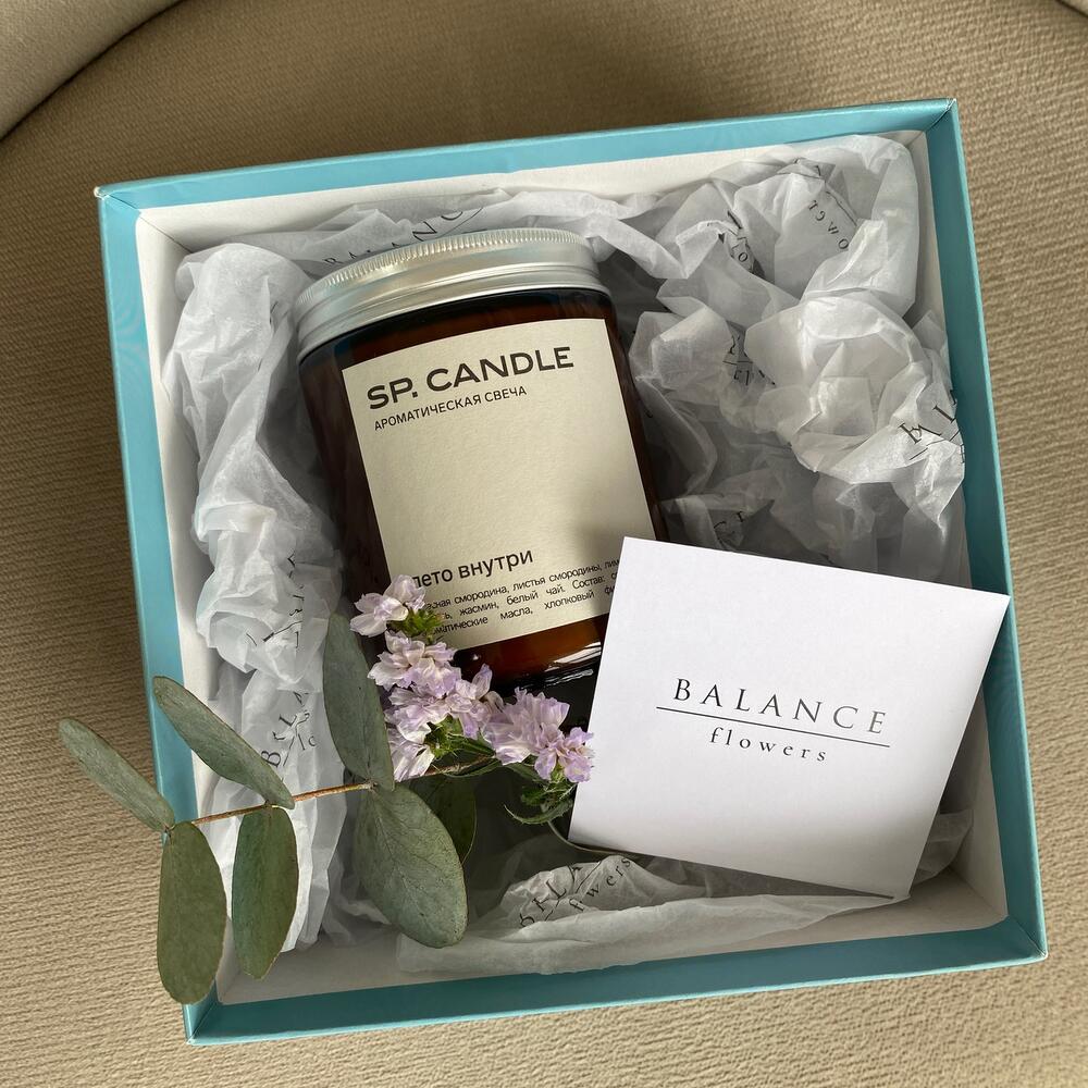 Подарочная коробка со стильной аромасвечой из натурального соевого воска. В коробке получатель найдет фирменную открытку и мини букетик сухоцветов.